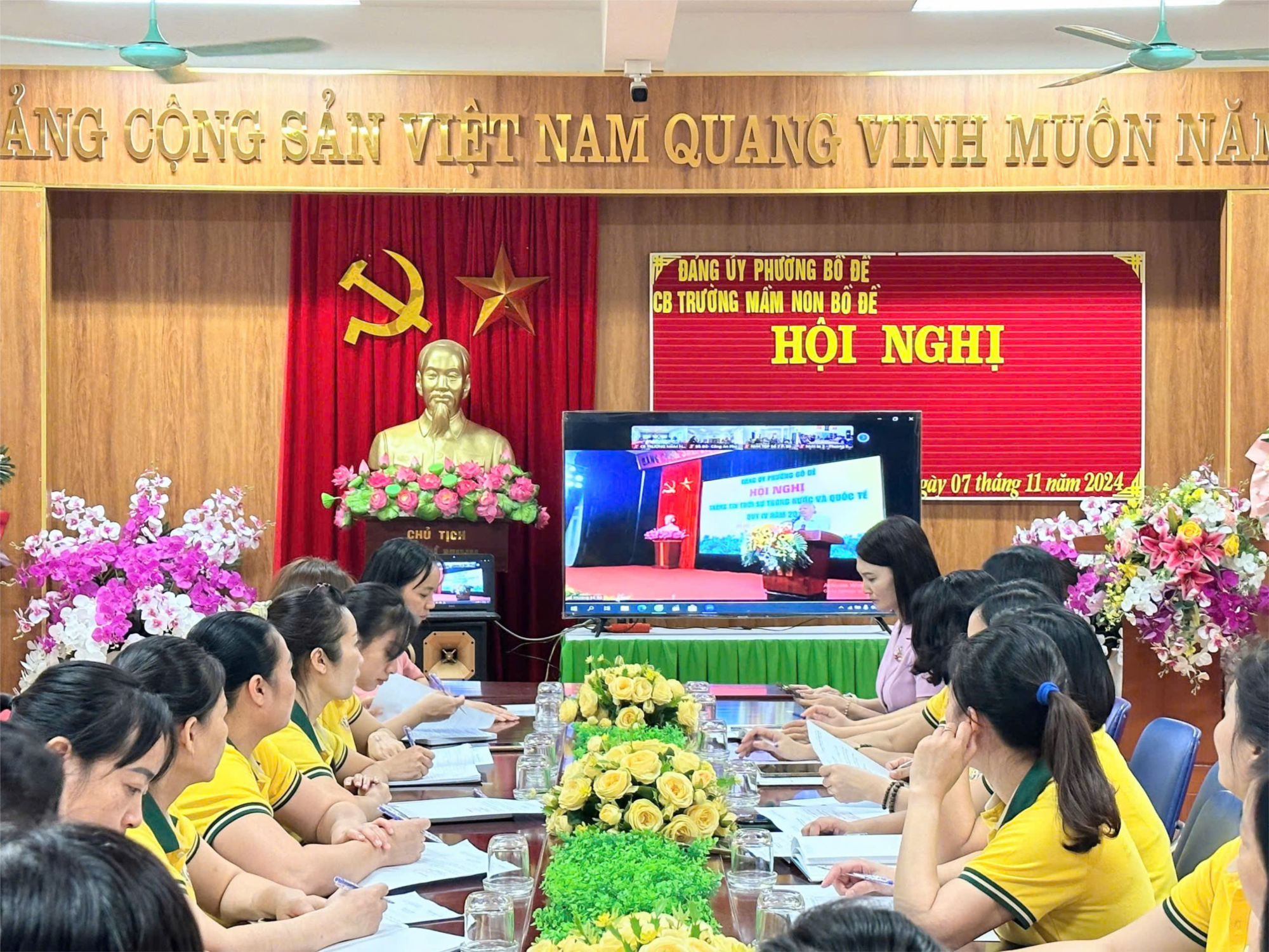 Thực hiện Chương trình công tác năm 2024 của BCH Đảng bộ phường Bồ Đề về tổ chức Hội nghị thông tin tình hình thời sự trong nước và thế giới Quý IV năm 2024. Sáng ngày 7/11/2024, 100% cán bộ Đảng viên của Chi bộ trường mầm non Bồ Đề đã tham gia Hội nghị trực tuyến tại phòng hội đồng của nhà trường.