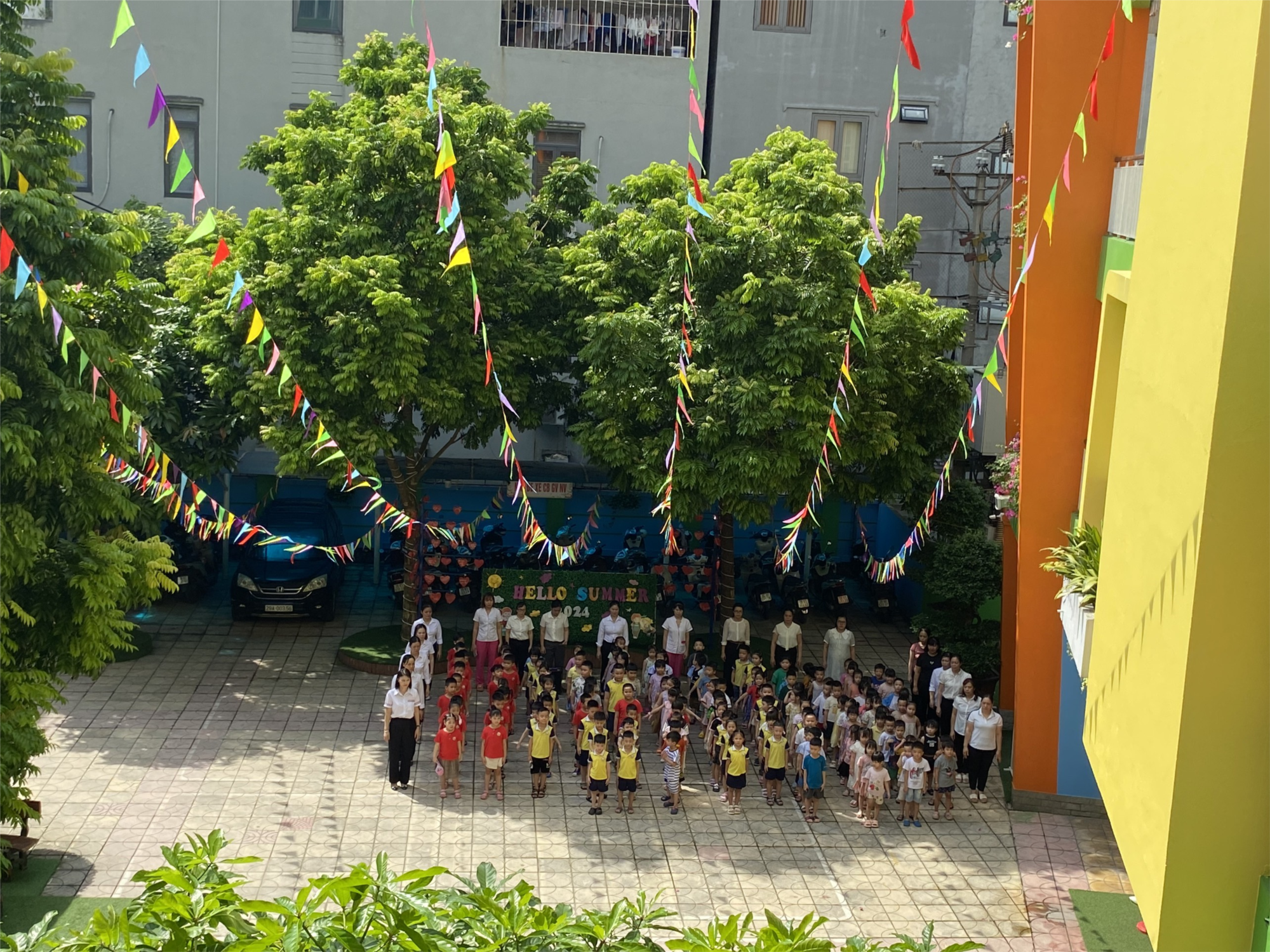 Vào lúc 9h sáng ngày 26/7, Cô và trò trường Mầm non Bồ Đề đã tổ chức lễ treo cờ rủ Quốc tang và mặc niệm, tưởng nhớ Tổng Bí thư Nguyễn Phú Trọng.