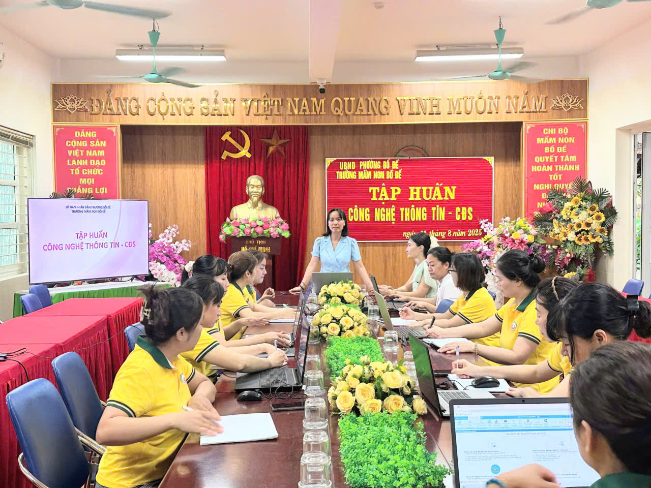 Trong hai ngày 31/7 và 1/8 vừa qua, Trường Mầm non Bồ Đề đã tổ chức buổi tập huấn chuyên sâu về ứng dụng công nghệ thông tin (CNTT) cho 100% đội ngũ giáo viên. Buổi tập huấn do đồng chí Nguyễn Thị Hiếu - Phó Hiệu trưởng nhà trường trực tiếp hướng dẫn, dưới sự chỉ đạo của đồng chí Lương Thị Tuấn Anh - Bí thư Chi bộ, Hiệu trưởng nhà trường.