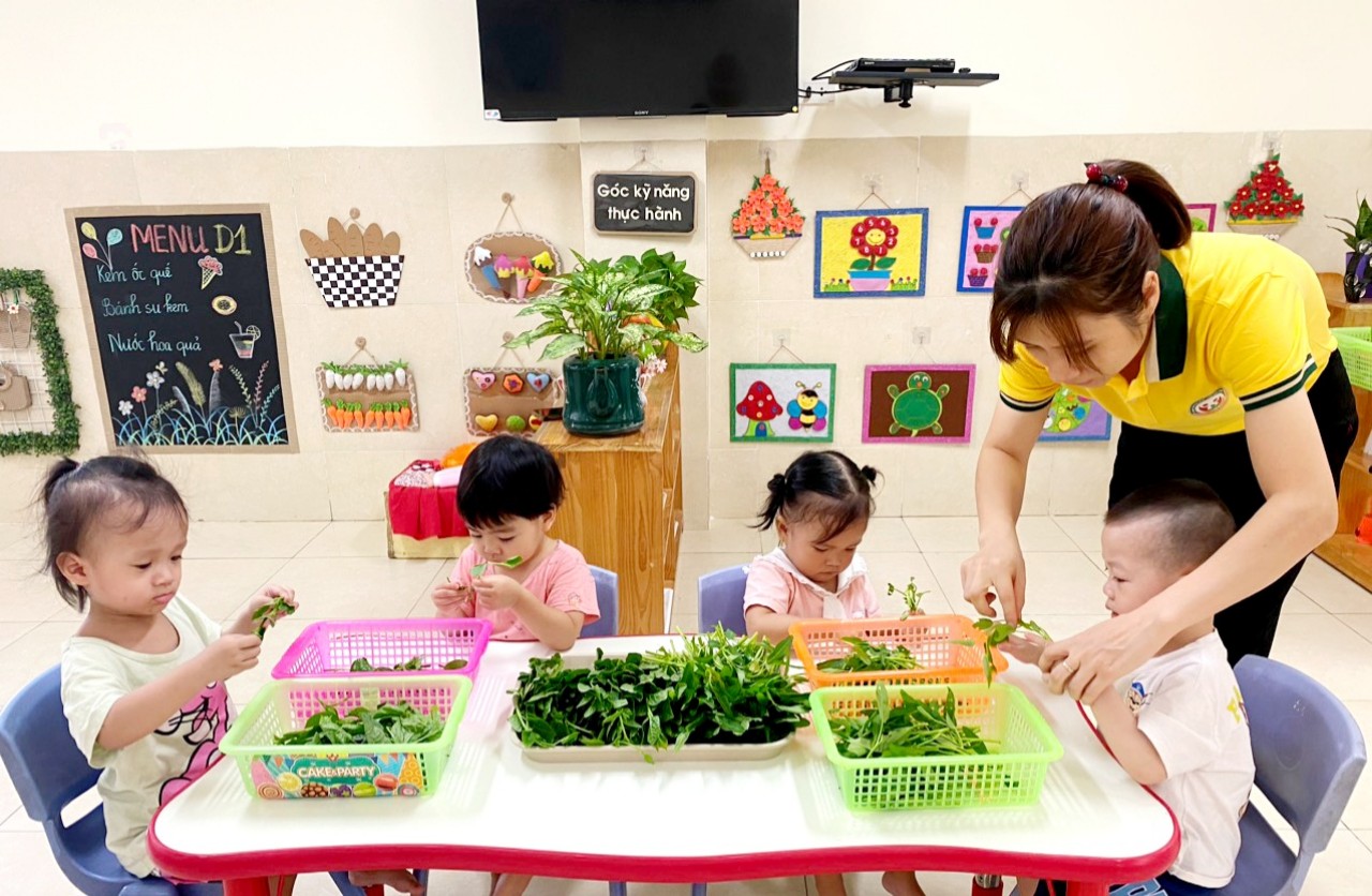 Vừa qua, các cô giáo lớp nhà trẻ D1 đã có một tiết học kỹ năng thực hành cuộc sống dành " Kỹ năng nhặt rau" dành cho tất cả các bé. Bắt đầu buổi học, cô giáo đã giưới thiệu cho các bé về những loại rau mùa hè, hình dáng, đặc điểm và cách chế biến một số món ăn từ loại rau đó. Tiếp theo là quy trình nhặt rau, các cô đã hướng dẫn tỉ mỉ để bạn nào cũng có thể làm được. Có thể nói, đây là một trong những điều mới lạ đối với các bé nhà trẻ nhưng bạn nào cũng say mê, miệt mài làm việc trong niềm vui thích.
