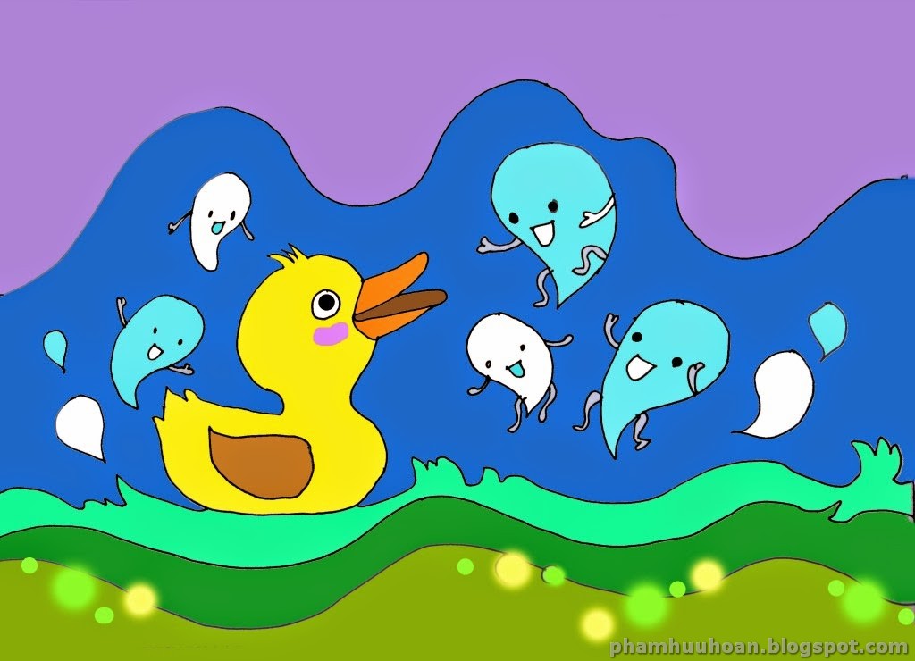 - Vịt con ơi, có thấy chúng mình không? Chúng mình là những hạt nước bé xíu từ sông, từ biển cả đấy!