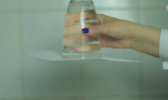 Thực hiện: Đổ nước đầy miệng ly, sau đó !important; đặt tờ giấy lên trên, đặt tay lên giấy và giữ chặt, sau đó bạn lật ngược ly nước, từ từ thả tay ra.