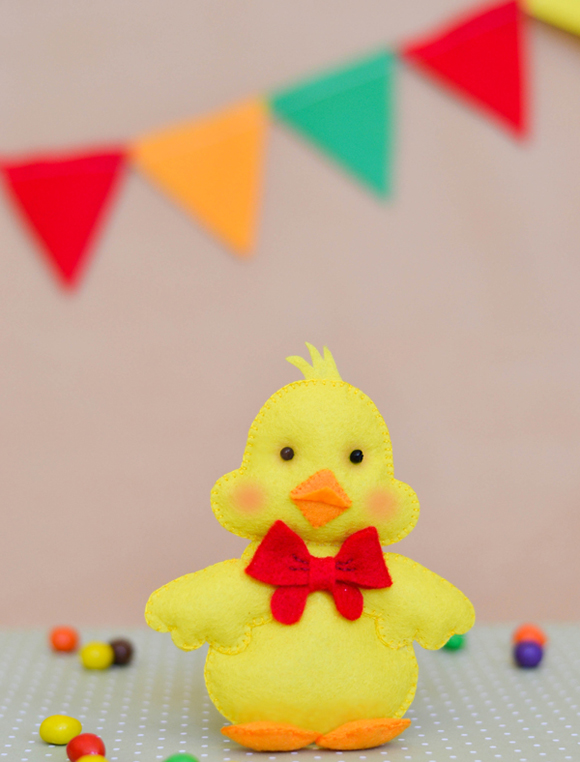 4.  !important;Khâu 2 tấm màu cam làm mỏ chú gà. Lưu ý: chỉ khâu ½ tấm hình. Đặt tấm mào gà vào giữa 2 tấm đầu, khâu đường viền mép, chừa đoạn trống nhồi bông vào bên trong và khâu kín. Khâu thêm 2 hạt cườm màu đen làm đôi mắt.