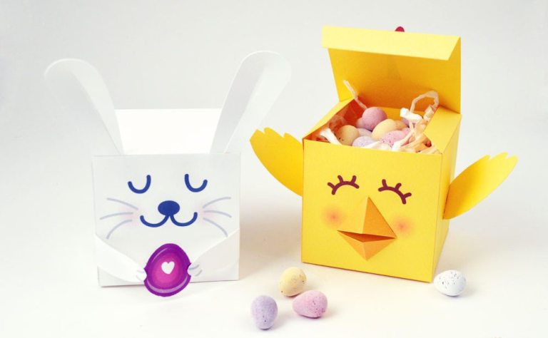 Bước 1: In mẫu ra giấy và cắt theo hình mẫu. Chúng ta sẽ thực hiện làm hộp giấy đựng hình chú thỏ trắng và gà con.