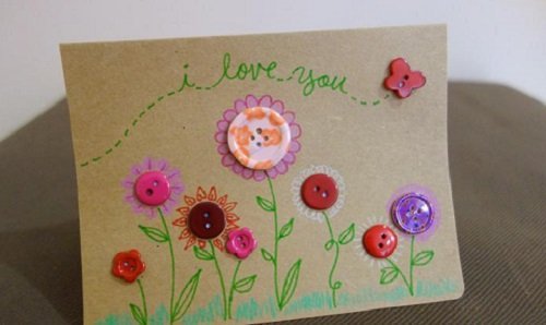 - Bước 2: Chọn những chiếc cúc áo với màu sắc sặc sỡ và nổi bật rồi ướm lên tấm thiệp, sắp xếp cao thấp xen kẻ sao cho hài hòa, mềm mại. Sau đó dùng keo dán những chiếc cúc áo lên thiệp như lúc đã định hình từ trước và chờ khoảng 1 lúc để keo được khô.