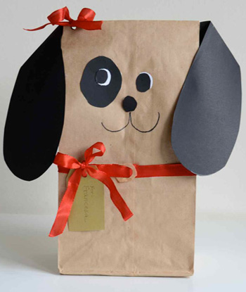 Nếu muốn tạo hì !important;nh cô nàng cún điệu đà, hãy gắn thêm chiếc ruy băng thắt hoa quanh bụng, và trên mép túi tạo hình chiếc nơ cài nhỏ nhỏ xinh xinh. Ngược lại, tạo hình “cậu cún” dán một dãi màu tạo ngay dưới miệng, cắt chiếc giấy hình khúc xương và dán lên đó.