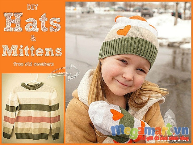 Chiếc áo len cũ mà bé đã mặc chật hoặc đã bị bẩn không thể mặc tiếp được, mẹ hoàn toàn có thể tái chế nó thành một đôi găng tay hay một chiếc mũ len cho bé mà không cần quá cầu kì và tốn nhiều công sức. Chỉ cần cắt chúng theo hình găng tay hoặc mũ của bé và may lại là bé đã có những món đồ mới thật đẹp và ấm áp do chính tay mẹ làm cho.