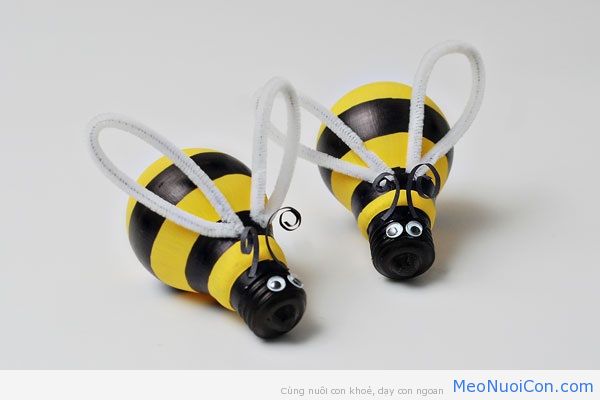 – Dùng keo nối 2 đầu của sợi dây lại và gắn chúng vào phần cổ bóng đèn tương ứng với phần cánh của con ong.