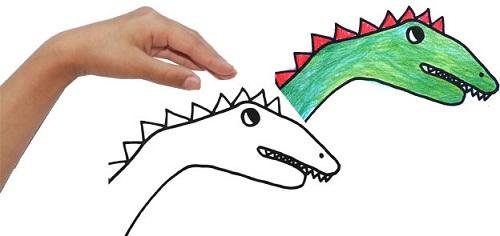 Các bé trai hẳn rất thích vẽ con khủng long. Ngón cái khẽ xòe ra ngoài để tạo khe hở cho bé vẽ răng nhọn trong miệng khủng long. Thêm một hàng gai nhọn tô đỏ trên thân hình màu xanh và mắt tròn to là chú khủng long đã được tạo hình rồi! Các đường nét bàn tay đặt gấp khúc rõ nét cho giống với vẻ cứng rắn của khủng long nhé.