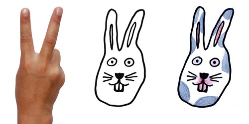Vẫn cùng một cách nắm tay như trên nhưng ngón trỏ và ngón giữa nhô thẳng lên, đích thị là hai tai dài của thỏ rồi! Vẽ thỏ thì không thể thiếu hai cái răng cửa to và dài, còn râu thỏ vẽ ngắn hơn râu mèo. Mắt thỏ tròn và lòng tai cũng được vẽ dài theo dáng tai.