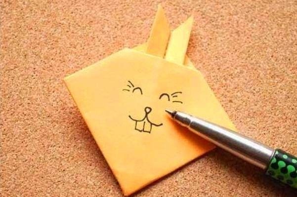 : Mẹ lật ngược lại mặt sau và sẽ thấy hình tai thỏ dễ thương. Mẹ đừng quên lấy bút màu để vẽ mắt, mũi, miệng cho thỏ. Mẹ có thể vẽ thỏ cười, khóc, mếu… tạo thành một gia đình thỏ với nhiều cảm xúc khác nhau.