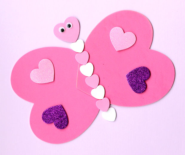 – Dùng 2 trái tim nhỏ hơn để trang trí trên mỗi cánh bướm.