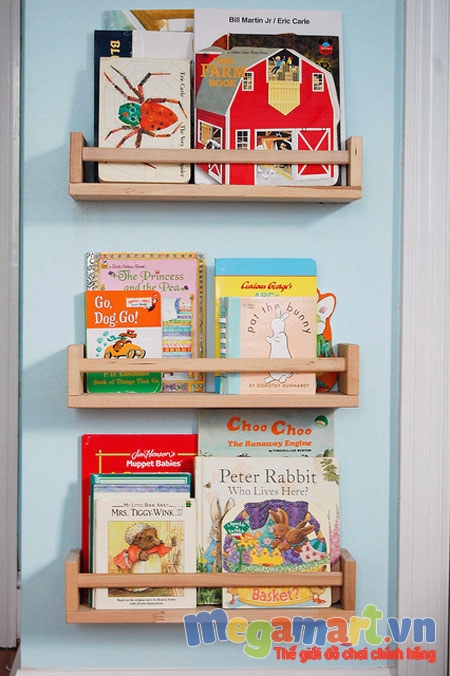 Các ông bố hoặc có thể là chính các mẹ cũng có thể đóng cho con những chiếc giá đựng sách đơn giản mà gọn gàng như thế này. Hoặc nếu không có gỗ thừa thì thay vì mua giá sách đắt tiền, bố mẹ có thể mua những chiếc giá hay kệ đựng gia vị để làm giá sách cho con.