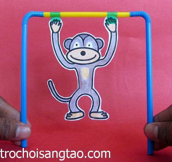 Sau khi liê !important;n kết những đầu ống hút với nhau, giờ bạn có thể dùng tay xoay 2 chiếc ống hút ở 2 bên để chú khỉ có thể nhào lộn liên tục rồi đấy! Thật thú vị phải không nào?