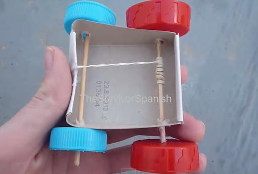 Bước 3: Cho một đầu que gỗ qua hai lỗ là !important;m trục bánh xe. Cho hai nắp chai màu đỏ vào hai đầu que làm bánh xe sau, bẻ ngắn một đầu cho phù hợp.(0:22)