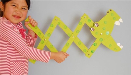 Cách làm đồ chơi hình chú cá sấu này trông thật ngộ nghĩnh mà không kém phần thú vị cho các bé đâu nhé. Mẹ có thể làm thanh bìa dài chừng 20cm - 25cm là vừa tầm tay của bé, cầm hai thanh cạnh nhau và kéo đẩy thử xem nào, bạn sẽ nhìn thấy cá sấu đang nhe răng dần ra đấy. Món đồ chơi vừa lạ lại độc đáo, sẽ gây cho các bé nhiều tò mò và bất ngờ lắm đấy. Chắc chắn bé sẽ cực thích thú với chú cá sấu 3D này.