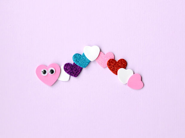 – Phần thân dùng 8 trái tim kích thước bằng nhau, nhỏ hơn dán nối tiếp. Có thể xen kẽ những trái tim màu sắc khác nhau để làm “bạn” sâu thêm nổi bật.