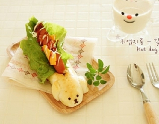 Bánh chín banh cho bánh ra, lấy 1 chiếc dao và cắt dọc bánh (tính chừa phần đầu cún ra nhé và không xắt đứt) rồi cho rau xà lách, xúc xích, ketchup và phomai vào. Với phần đầu cún bạn có thể dùng socola để vẽ mắt, tai, mũi tạo mặt cún.