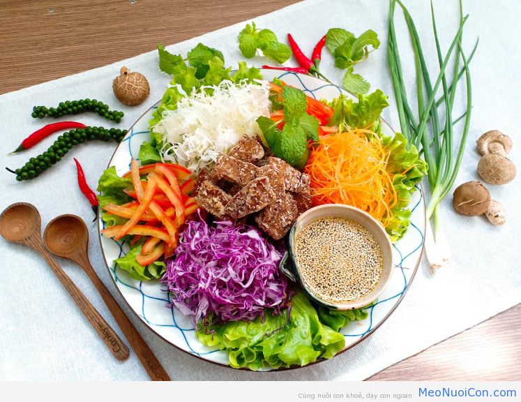 3. Xếp xà !important; lách ra đĩa, lấy đĩa rau trong tủ mát ra và xếp cho đẹp mắt, có thể cắt sợi cà chua vào thêm tùy thích, thịt bò chay chiên giòn xếp vào đặt ở giữa. Dọn kèm chén xốt chua ngọt, khi thưởng thức thì rưới đều lên salad và chầm chậm thưởng thức bạn nhé!
