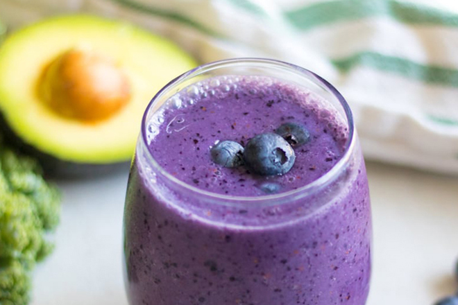 Cho việt quất, bơ và !important;o máy xay sinh tố xay nhuyễn. Cho 1 muỗng nước lọc xay thêm khoảng 30 giây. Cuối cùng cho một nửa hũ sữa vào là bạn đã có một ly sinh tố bơ việt quất thơm ngậy vị chua chua cho bé rồi.