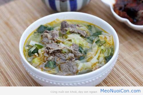 – Đun nóng dầu ăn, phi tỏi thơm, cho thịt bò vào xào chín, đổ thịt bò ra bát riêng. Dùng lại nồi đó thêm vào khoảng hai bát con nước lạnh, đun sôi thì cho bắp cải vào đun cùng, nêm gia vị lại cho vừa ăn, đun đến khi bắp cải chín theo ý thích của bạn thì cho bát thịt bò vào đun cùng, đợi sôi lại nêm nếm lại tùy theo khẩu vị của bạn
