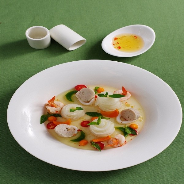 Bước 3: Cho phở đã chiên ra đĩa cuốn tròn lại. Gắp hỗn hợp cà-rốt, ớt Đà Lạt, mực, tôm, bò viên vào trang trí
