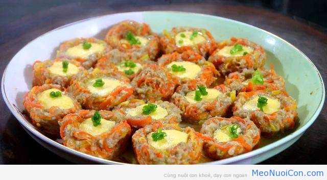 3 củ cà rốt, 1 lạng thịt lợn xay, 2 quả trứng gà, muối, dầu hào, bột mỳ.