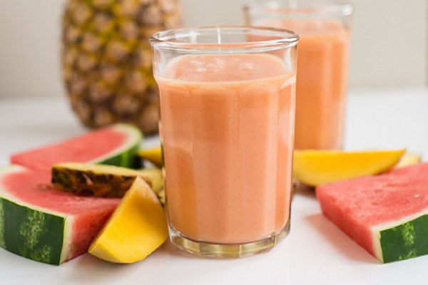 - Dưa hấu, mẹ gọt bỏ vỏ và !important; hạt, xắt nhỏ thành từng miếng. Xoài mẹ cũng gọt vỏ, lấy phần thịt. Rồi mẹ cho dưa hấu, xoài, sữa chua vào máy xay sinh tố, xay nhuyễn. Mẹ có thể lọc qua rây hoặc không, rồi cho bé thưởng thức.