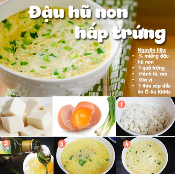Món đậu hũ non hấp trứng mềm thơm vừa dễ ăn lại vừa đủ dưỡng chất. Món ăn không chỉ được bổ sung dầu ô–liu Kiddy giàu Omega 3, 6, 9, Vitamin E, K và hợp chất chống ôxy-hóa Polyphenol tự nhiên có sẵn, mà còn được bổ sung tối đa hàm lượng Vitamin A, E, D có tác dụng hỗ trợ cho sự phát triển toàn diện của trẻ.