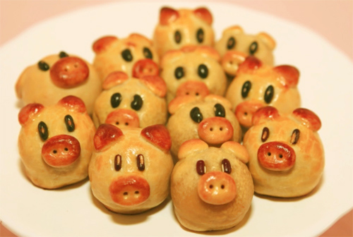 Bước 4 : Cho nhân bánh vào giữa miếng bột rồi bao tròn lại. Sau đó bạn dùng kẹo làm mắt và nặn thêm mõn cho chú heo