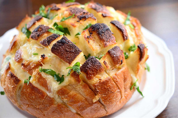 - Xẻ bá !important;nh mì thành nhiều đường ngang – dọc trên thân bánh để tạo thành những ô vuông nhỏ. Bánh rạch mạnh tay nhưng không làm đứt bánh, sau đó thì nhét phô mai cheddar vào những khe hở của bánh mì.