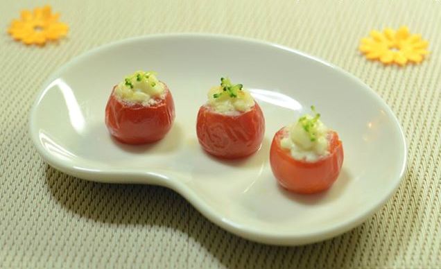 - Bước 2:  !important;Phô mai thái miếng nhỏ vừa với miệng quả cà chua.