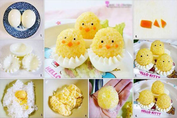 7. Trang trí !important; tỉ mỉ một chút là bạn đã có ngay một chú gà con siêu cấp đáng yêu từ cơm nắm trứng gà rồi.