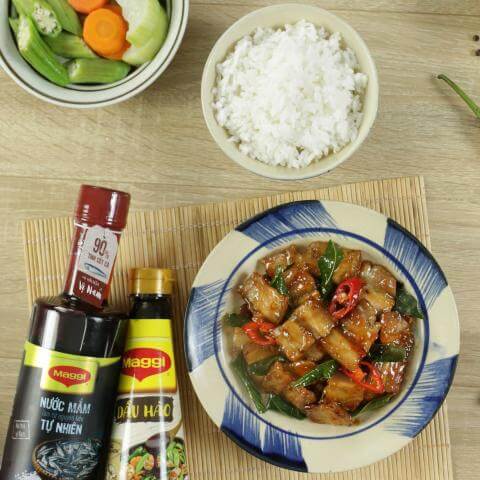 - Bước 4: Phi thơm 10gr đầu hành và 10gr tỏi băm nhuyễn, cho vào 2 muỗng canh đường, 1 muỗng canh dầu hào Maggi và 3 muỗng canh nước mắm Maggi vào rồi đảo đều, chờ sôi lên.