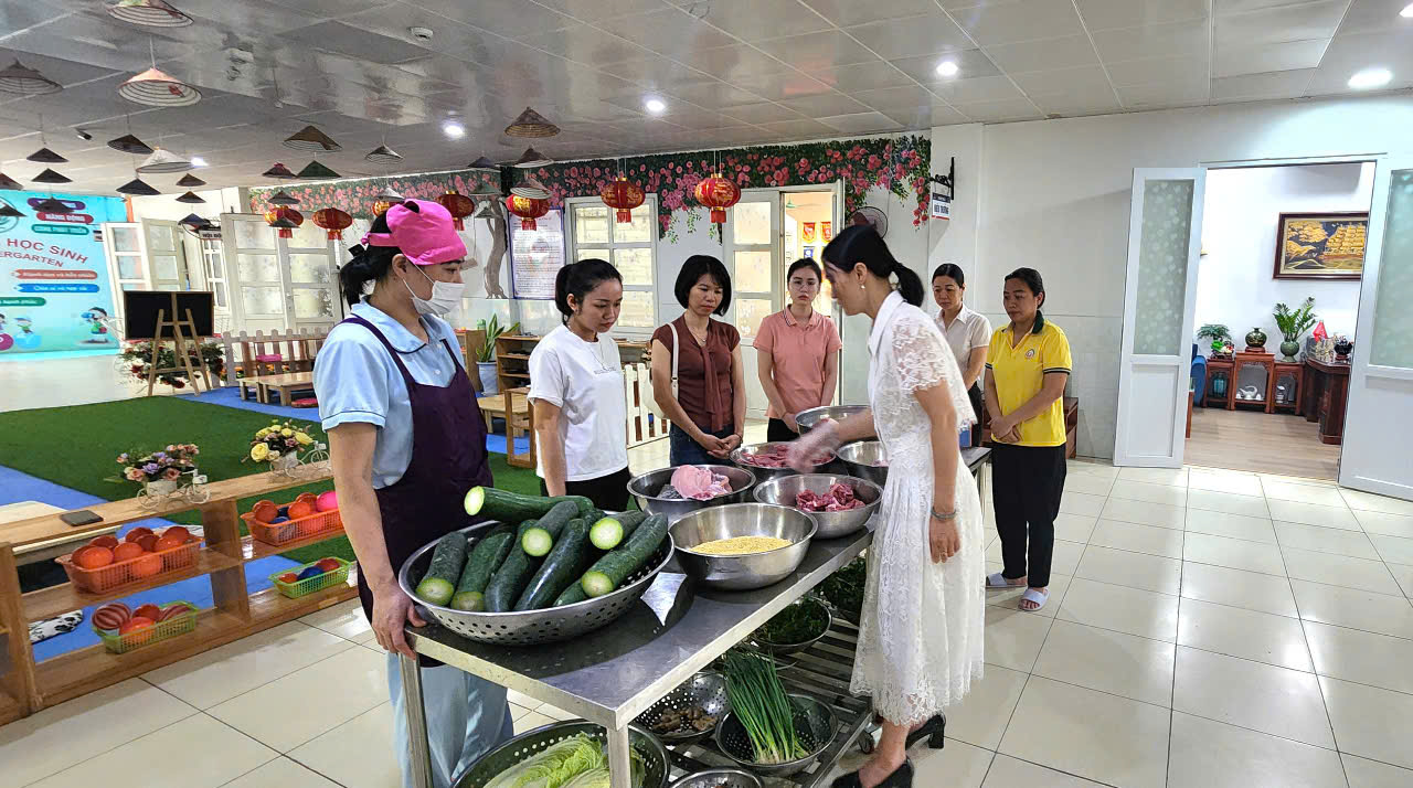Đến kiểm tra, giám sát và chỉ đạo buổi giao nhận thực phẩm có đồng chí Lương Thị Tuấn Anh- Bí thư chi bộ, Hiệu trưởng nhà trường, cùng các đồng chí là kế toán, đại diện giáo viên, nhân viên tổ bếp và sự có mặt của Ban đại diện cha mẹ học sinh nhà trường. Quy trình giao nhận thực phẩm được kiểm tra rất nghiêm ngặt, thực phẩm như thịt cá phải đảm bảo tươi ngon, không có mùi lạ. Rau xanh tươi ngon, không bị dập nát, các thực phẩm hàng khô đóng túi ghi rõ địa chỉ sản xuất, ngày sản xuất, hạn sử dụng...