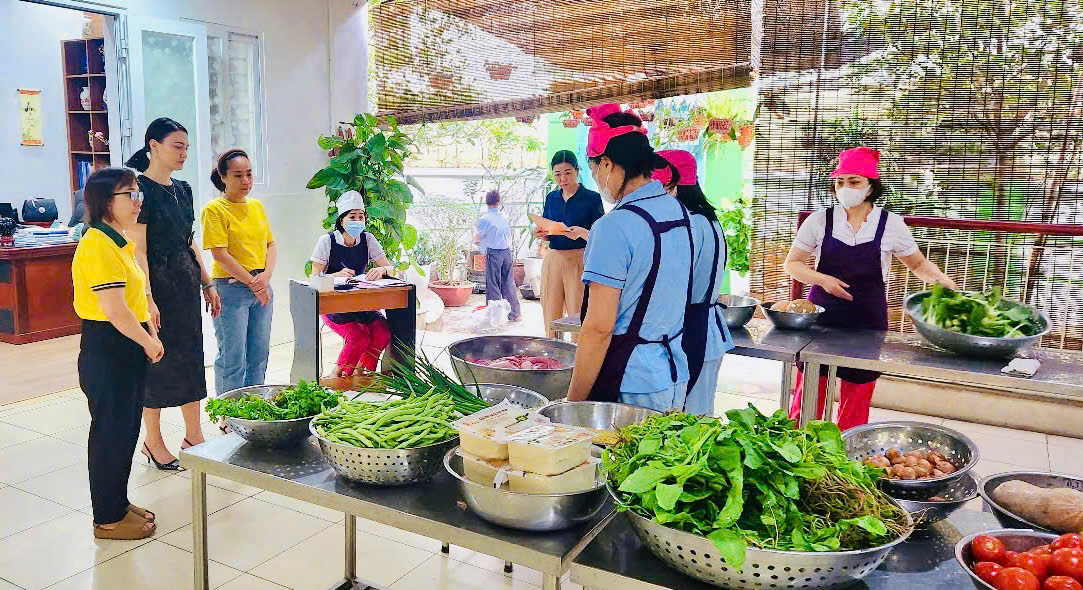 Thực hiện quy trình bếp ăn một chiều, từ khâu sơ chế, chế biến thức ăn và chia ăn cho trẻ, mỗi khâu đều được các cô nhân viên nuôi dưỡng thực hiện đúng dây chuyền làm việc, nhằm đảm bảo vệ sinh an toàn thực phẩm, phòng tránh ngộ độc thực phẩm cho trẻ.