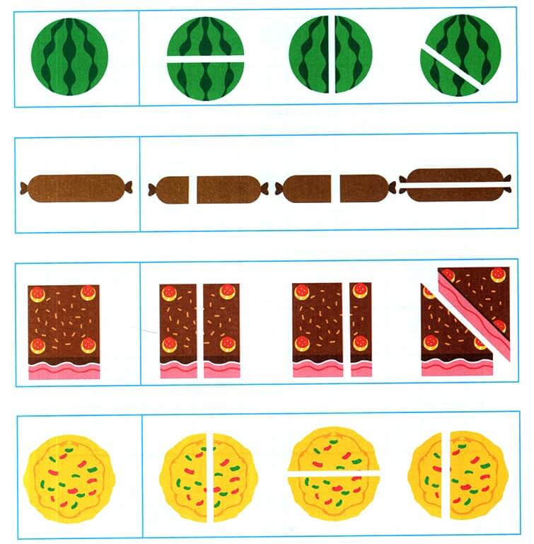 Bài toán: Bạn Hoa muốn chia thức ăn thành hai phần bằng nhau để dành cho em gái của mình. Em hãy khoanh tròn vào trường hợp nào chia không đều trong mỗi khung hình dưới đây nhé! Cách dạy trẻ: Bố mẹ chỉ vào từng hình rồi hỏi xem quả này, cái này đã chia đều hay chưa?