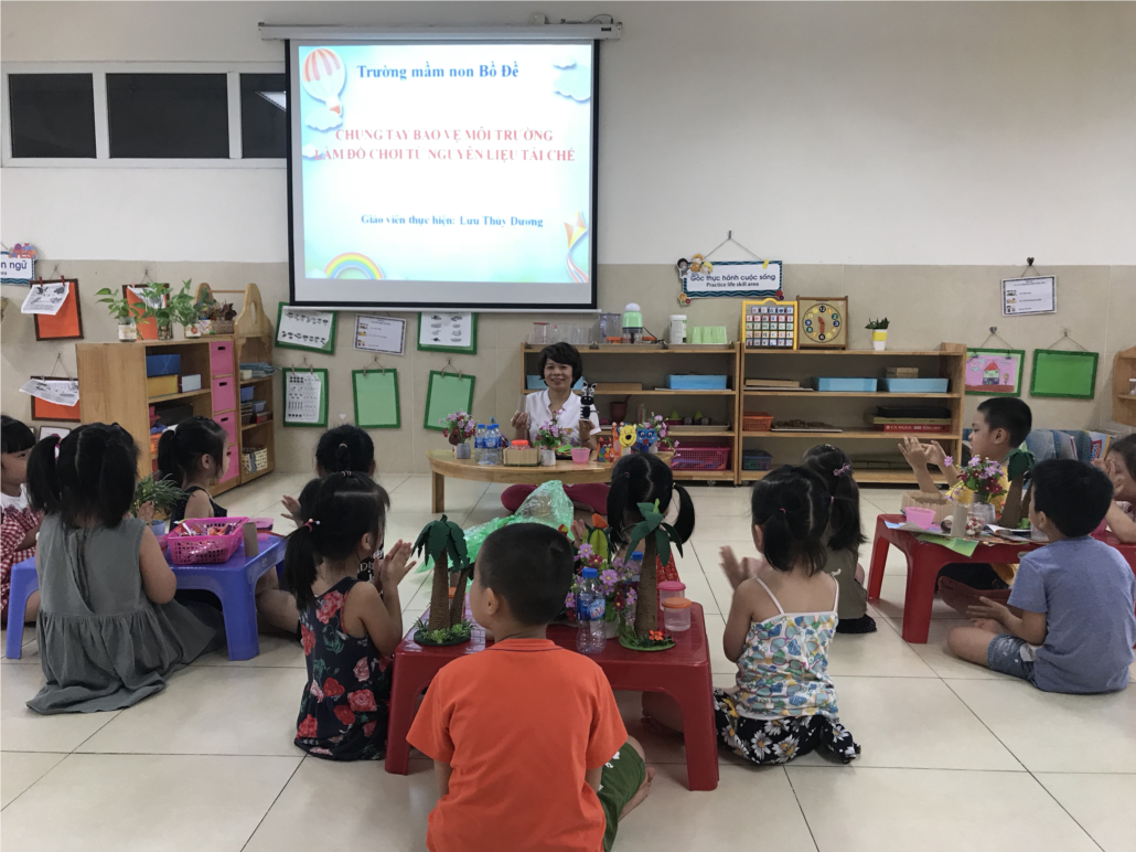Thông qua tiết học của các conđã biết chung tay chống rác thải nhựa qua những vật dụng hàng ngày. Đồng thời các con được cô giáo hướng dẫn làm đồ dùng, đồ chơi từ chai nước lọc, dán những hộp sữa chua thành hình con chim hoặc hình ô tô tinh nghịch..... Các con đều rất thích thú khi được cô hướng dẫn tự tay làm ra những sản phẩm ngộ nghĩnh.