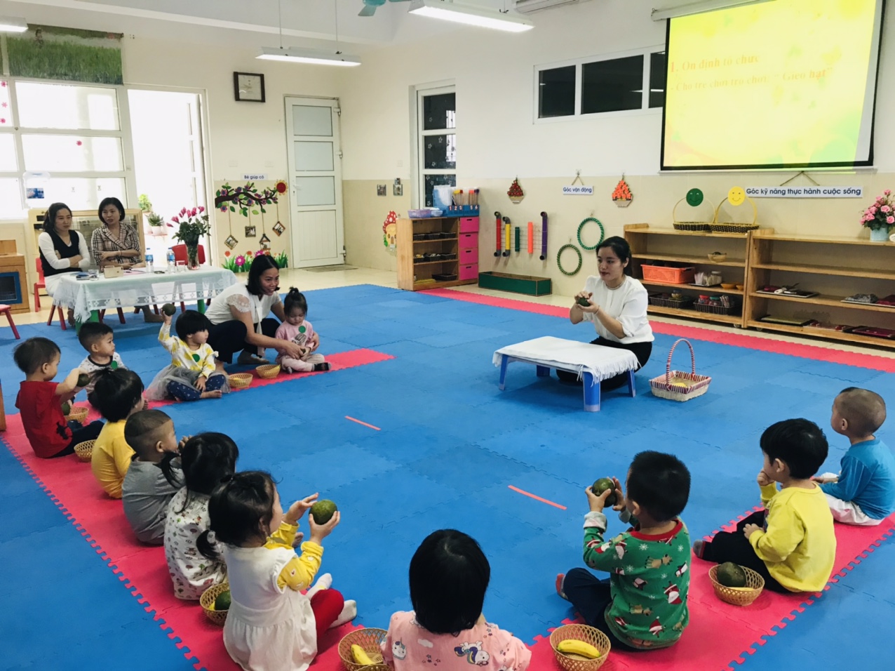 Để phát triển ngôn ngữ cho trẻ lứa tuổi Nhà trẻ. Hôm nay các Cô giáo lớp Nhà trẻ D1 (24 - 36 tháng) tổ chức hoạt động nhận biết tập nói: “Quả cam – Quả chuối”. Thông qua hoạt động này trẻ khám phá hiểu biết về mọi sự vật hiện tượng, thế giới xung quanh trẻ. Bạn nào, bạn ý cũng hào hứng trong hoạt động, các con biết trả lời các câu hỏi của Cô và của bạn và được chơi trò chơi thật là vui đấy.