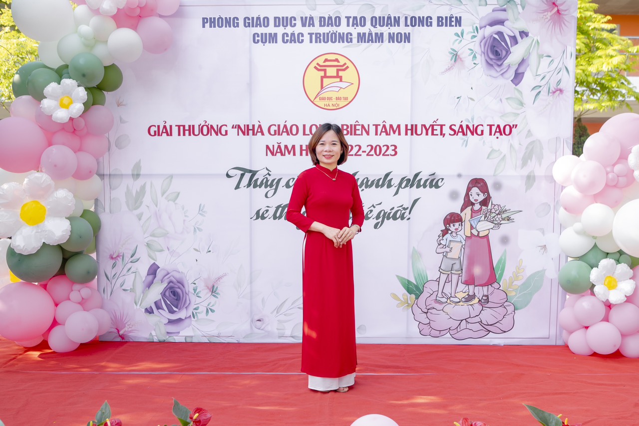 Đại diện cho Tập thể CBGVNV Trường mầm non Bồ Đề, cô giáo Lưu Thuỳ Dương vinh dự được công nhận "Nhà giáo Long Biên tâm huyết, sáng tạo". Với lò !important;ng yêu nghề, nhiệt huyết và tận tâm, cô giáo Lưu Thuỳ Dương luôn có những đổi mới, sáng tạo trong việc tổ chức các hoạt động cho trẻ. Với 24 năm kinh nghiệm chăm sóc giáo dục trẻ, cô giáo luôn yêu thương, tôn trọng ý kiến cá nhân, đối xử công bằng với trẻ, được phụ huynh yêu quý và tin tưởng.
