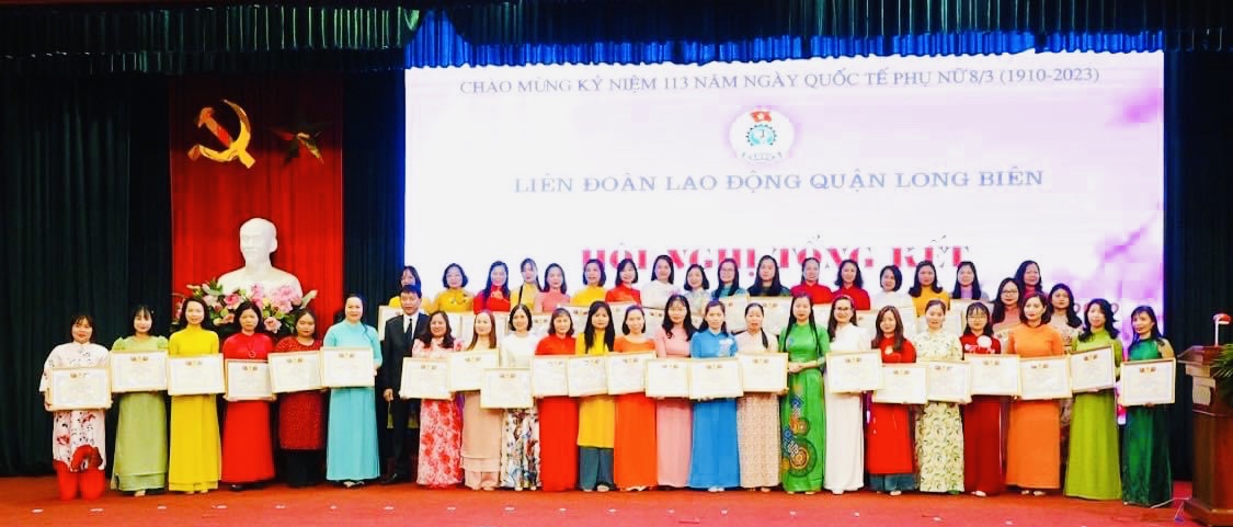 !important; Sáng ngày 08/03/2023, Liên đoàn lao động quận Long Biên tưng bừng tổ chức lễ kỷ niệm 113 năm ngày Quốc tế phụ nữ 8/3 và 1983 năm khởi nghĩa Hai Bà Trưng, gặp mặt nữ cán bộ Công đoàn cơ sở; biểu dương nữ công nhân, viên chức, lao động tiêu biểu trong phong trào thi đua "Giỏi việc nước, đảm việc nhà" năm 2022.