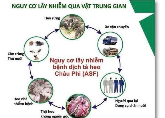 Vi rút dịch tả lợn Châu Phi lây nhiễm qua đường hô hấp và tiêu hóa, thông qua sự tiếp xúc trực tiếp hoặc gián tiếp với các vật thể nhiễm vi rút như: Chuồng trại, phương tiện vận chuyển, dụng cụ, đồ dùng, quần áo nhiễm vi rút và thức ăn thừa chứa thịt lợn nhiễm bệnh.