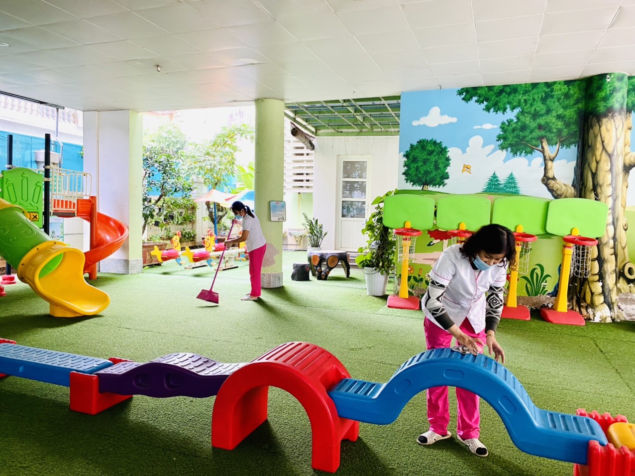 Hình ảnh Giáo viên thực hiện vệ sinh đồ chơi khu giáo dục thể chất