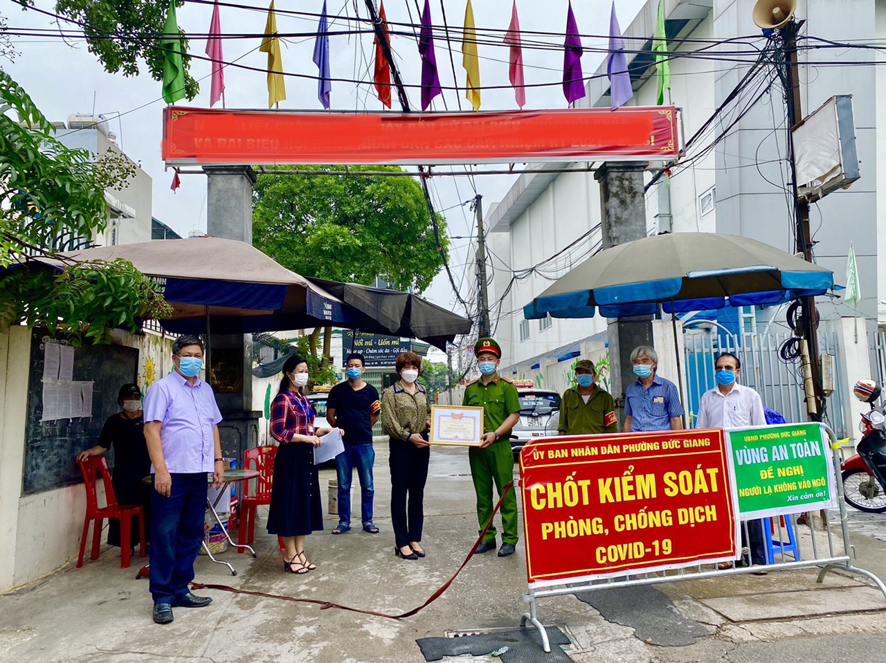 Sá !important;ng ngày 15/8/2021, thay mặt lãnh đạo Quận ủy – HĐND – UBND - UBMTTQ quận, đồng chí Vũ Thị Thân - UVTV, Trưởng Ban Tổ chức QU và đồng chí Nguyễn Quốc Long - UVTV, Trưởng Ban Dân vận QU, đã trực tiếp đến đơn vị, các chốt trực trao tặng giấy khen các tập thể, cá nhân tiêu biểu có thành tích đột xuất trong công tác phòng, chống dịch của phường Đức Giang và Bồ Đề
