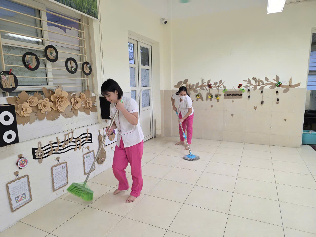 Sáng thứ Hai ngày 17/11/2025, Trường Mầm non Bồ Đề thực hiện công tác tổng vệ sinh đầu tuần sau phun thuốc muỗi nhằm đảm bảo an toàn, phòng chống dịch bệnh truyền nhiếm cho trẻ. Ngay từ sáng sớm, tập thể CBGVNV nhà trường đã có mặt để thực hiện công tác tổng vệ sinh môi trường sau khi phun thuốc muỗi. Các cô đã lau dọn, rửa đồ dùng, đồ chơi, lau lan can, tay vịn cầu thang tại các khu vực, các phòng chức năng.... Nhà bếp cũng lau rửa toàn bộ đồ dùng phục vụ nấu ăn cho trẻ, tráng nước sôi và cho vào tủ sấy khô... Sau một thời gian làm việc khẩn trương, nghiêm túc để kịp giờ đón trẻ đến lớp, các cô đã vệ sinh sạch sẽ, sắp xếp gọn gàng toàn bộ đồ dùng đồ chơi trong và ngoài lớp học, và các khu vực khác trong nhà trường, nhằm đem lại cho các bé một môi trường học tập an toàn, đảm bảo sức khỏe, hạn chế tối đa các tác nhân gây dịch bệnh. Các cô đã sẵn sàng chào đón bé yêu đến lớp, các bé hãy đến trường với cô và các bạn nhé.