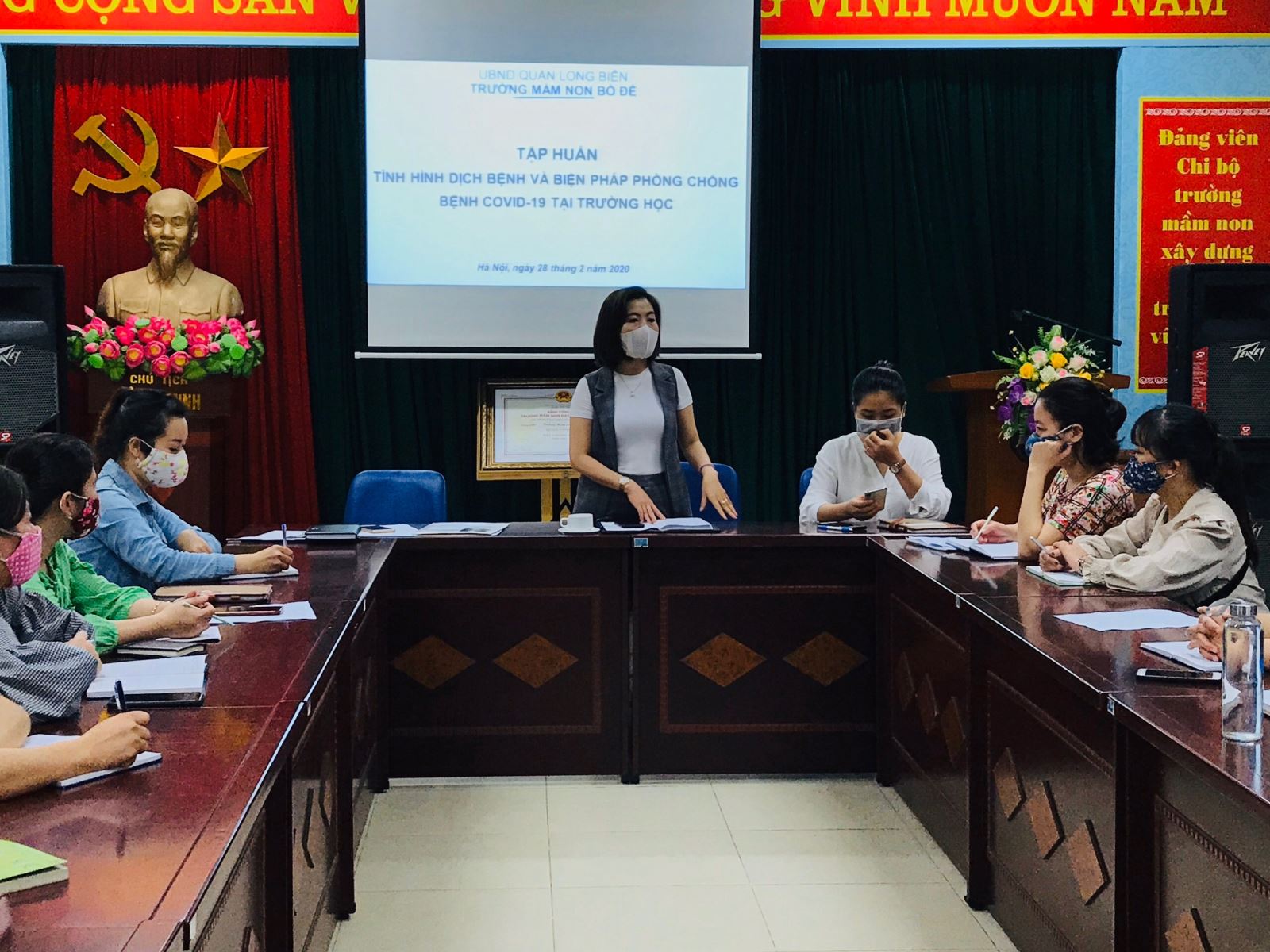 Tại buổi tập huấn, toàn thể cán bộ giáo viên, nhân viên đã được nghe đồng chí Trần Thị Tuyết Nhung – Hiệu trưởng nhà trường nêu rõ tầm quan trọng và nhiệm vụ cấp thiết trong công tác phòng, chống dịch bệnh gây ra và chuẩn bị phương tiện, vật dụng để chuẩn bị cho chiến dịch tổng vệ sinh môi trường, khử khuẩn trong nhà trường.