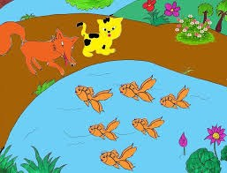 Mèo và Cáo thấy đàn Cá đang vui đùa dưới hồ. Mèo đứng trên bờ và nhẹ nhàng gọi: "Cá ơi, cá ơi. Lên đây mà chơi. Vui lắm, vui lắm". Đàn Cá liền hỏi lại: "Thế bạn có ăn thịt chúng tôi không?".