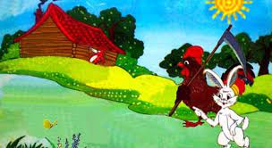 Gấu sợ quá !important; chạy đi mất. Thỏ lại ngồi dưới bụi cây và khóc. Một con Gà Trống mào đỏ đi qua, vai vác một cái hái. Gà Trống thấy Thỏ khóc, liền hỏi:
