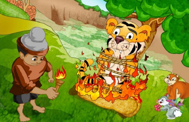 Thì cọp bảo về nhà lấy trí khôn cho xem, bác nông dân đồng ý và phải có điều kiện là trói cọp lại vào gốc cây để cọp không ăn thịt trâu của bác nông dân. Sau khi trói cọp vào gốc cây, bác nông dân đã châm lửa đốt và nói với cọp: