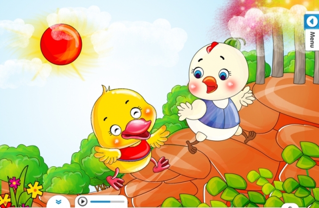 Thím vịt bận đi chợ xa đem con đến gởi bác Gà Mái mẹ. Gà mái mẹ gọi Gà con ra chơi với Vịt con. Gà con xin phép mẹ dẫn vịt con ra vườn chơi và tìm giun để ăn. Gà con nhanh nhẹn đi trước. Vịt con lạch bạch theo sau.